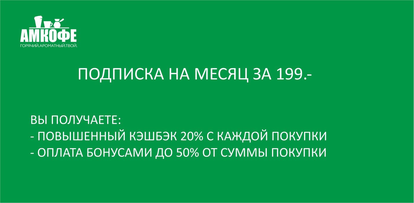 Подписка на кофе Оформите подписку на 1, 3, 6 или 12 месяцев и получайте повышенный кешбэк 20% и возможность оплаты покупок бонусами на 50% Оформить Поделиться