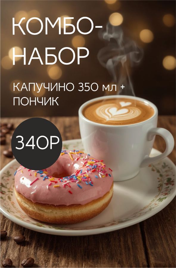 Теперь при покупке среднего стакана капучино и любого доната (пончика) на выбор вы получаете разовую скидку 50Р.