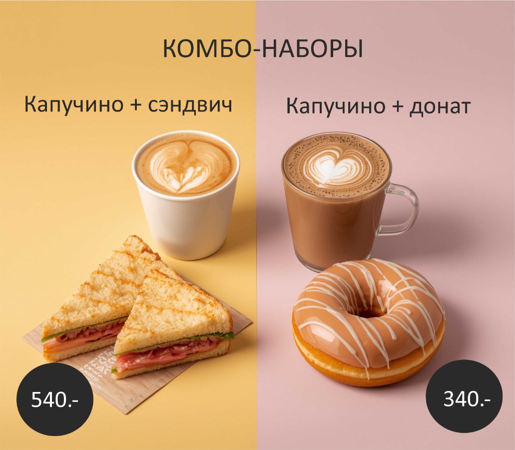 На выбор два варианта - сладкий и сытный. Капучино/сэндвич с лососем (или другой на выбор) и капучино/донат (на выбор).