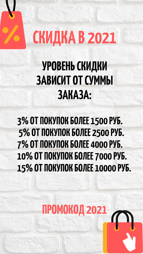 Новости Промокоды на 2021 год Друзья, в 2021 году промокод на скидки при заказе на сайте - 2021 Просто введите этот код в поле промо при офопмлении заказа и скидка рассчитается автоматически, в зависимости от суммы заказа. Таблица с уровнями скидки ниже. Хороших покупок! Поделиться Добавить комментарий