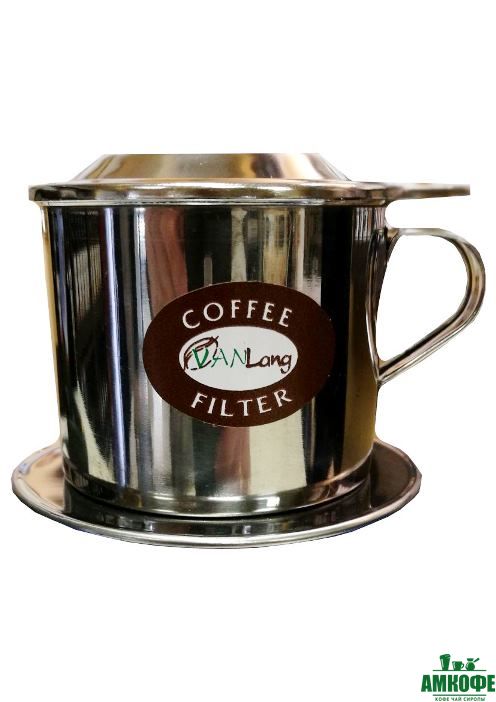 Вьтнамский стальной пресс-фильтр для заваривания кофе. Молотый кофе засыпается в ёмкость. Затем устанавливается на кружку и заливается горячей водой.