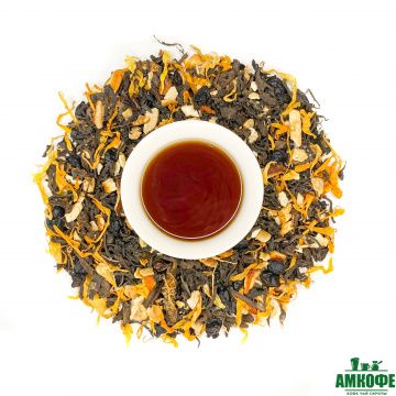 Знаменитый китайский чёрный постферментированный чай Пуэр с добавлением кусочков мандарина, лепестков календулы и ягод барбариса.