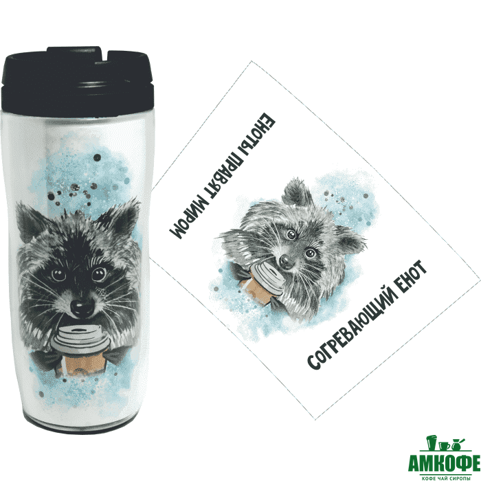 Термокружка "Енот" объёмом 350 мл., выполненная из пищивего пластика. Двойные стенки хорошо сохраняют тепло. Питейник плотно закрывается заглушкой.